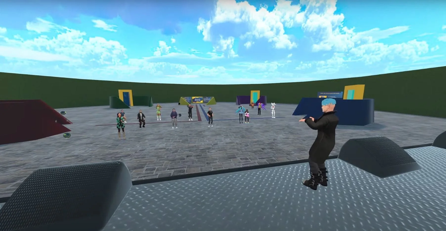 -New users are spawned into a welcome horseshoe with information like Meeting times and places, Surveys, and “About us” that has a link to the community web page.